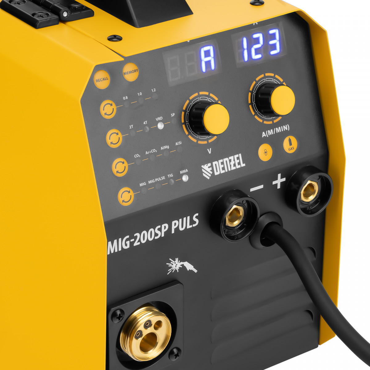 Инверторный аппарат полуавтоматической сварки Denzel IMIG-200SP Pulse совместим с катушками массой до 5 кг, работает со сварочным током до 200 A, продолжительность включения составляет 60%. Предназначен для сварки в среде защитных газов (MIG/MAG), сварки порошковой проволокой (FCAW), покрытым электродом (MMA), а также аргонодуговой сварки неплавящимся электродом (Lift TIG). Горелка TIG не входит в комплект поставки. При включенном режиме MIG PULSE доступна сварка пульсирующим постоянным током деталей или изделий из алюминиево-магниевого, а также алюминиево-кремниевого сплава.