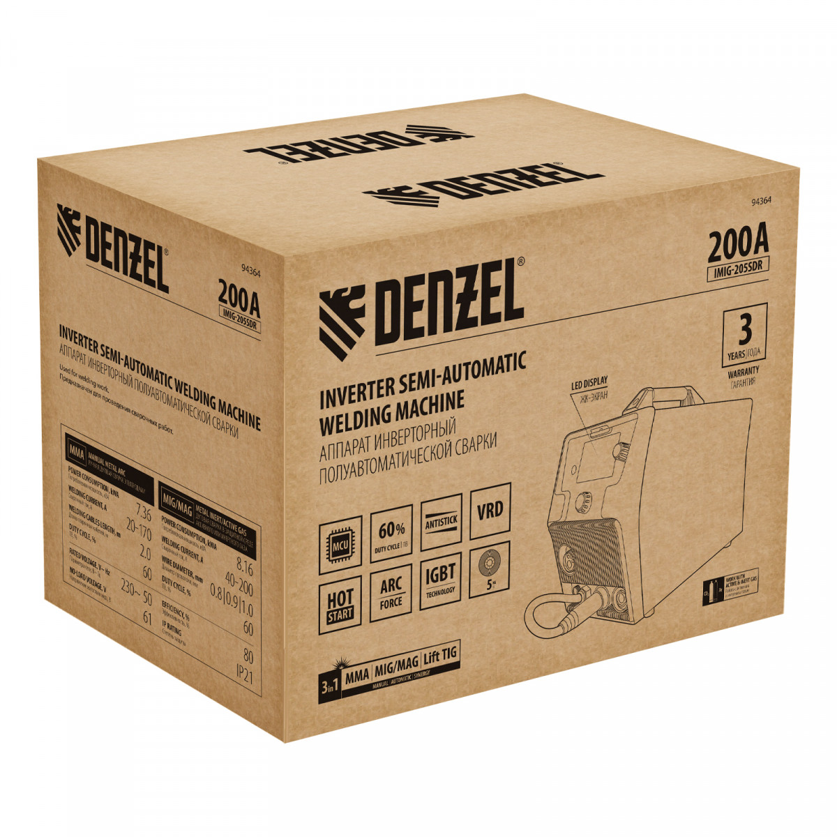Аппарат инвертор. полуавтомат. cварки IMIG-205SDR, 200 А, ПВ 60%, катушка 5 кг Denzel