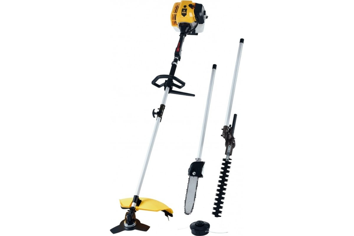 Мультифункциональный бензиновый триммер Denzel DGT-52S-MAX 96279 с двигателем объемом 52 куб. см и разъемной штангой предназначен для обработки газонов, избавления от сорняков, скашивания травы, борьбы с зарослями. Выдерживает интенсивные нагрузки, поэтому подойдет не только владельцам дачных участков, но и сотрудника сельскохозяйственных организаций и коммунальных служб.Возможность работы с оснастками разного типа обеспечивает универсальность применения. С помощью катушки с леской и ножа можно ухаживать за газоном, скашивать жесткую и густую траву. Пильный диск легко справляется с обрезкой молодого кустарника и побегов деревьев. А кусторез и высоторез пригодятся, чтобы придать форму декоративным кустам, создать живую изгородь и обрезать крупные ветки деревьев. Мощный двигатель на 3 л. с. и частота вращения оснастки 9500 об/мин позволяют эффективно бороться с растительностью — за час можно обработать площадь до 20 соток.