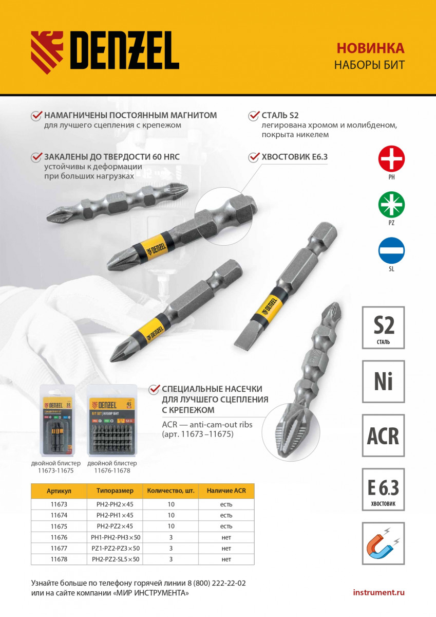 Набор двусторонних бит PH2-PH2 х 45 мм Denzel 11673 из стали S2, 10 шт. в упаковке, предназначен для монтажа/демонтажа саморезов по дереву и других резьбовых соединений с помощью шуруповерта. Насадки с двумя рабочими профилями самого ходового размера PH2 подходят как для бытового, так и для профессионального использования.