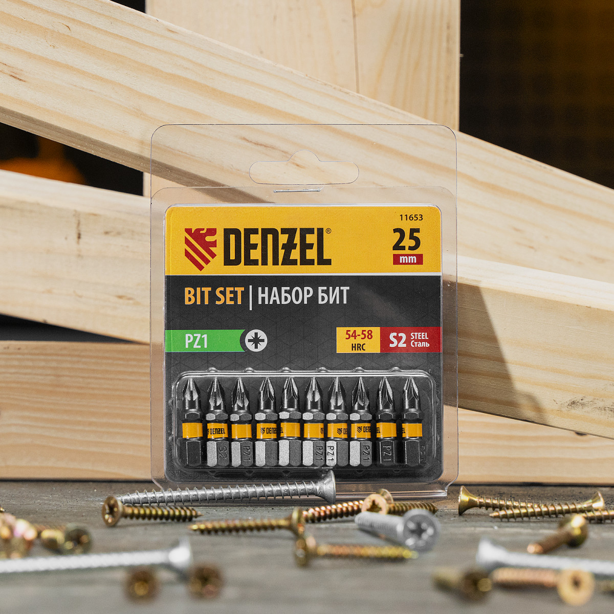- Защита от подделок — цветное кольцо с логотипом ТМ Denzel на каждой бите подтверждает оригинальность товара.