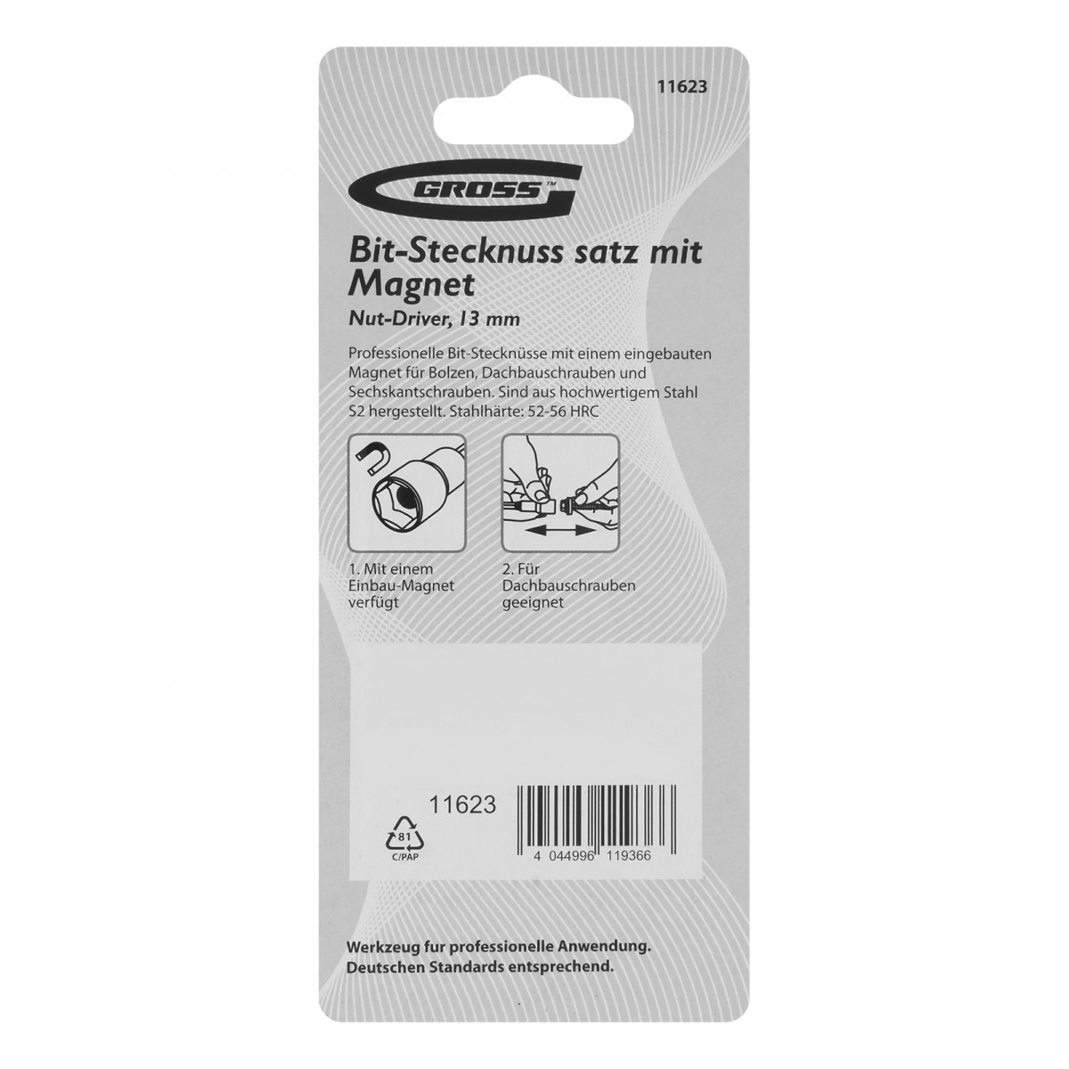 Бита с торцевой головкой Gross Nut-Driver 11623 из стали S2, размером 13 мм, с магнитом, применяется в качестве профессиональной оснастки для шуруповертов. Она предназначена для монтажа и демонтажа болтов, шурупов и кровельных саморезов, имеющих шестигранную головку. Насадка выдерживает интенсивные нагрузки и сохраняет рабочие свойства даже при длительном использовании.