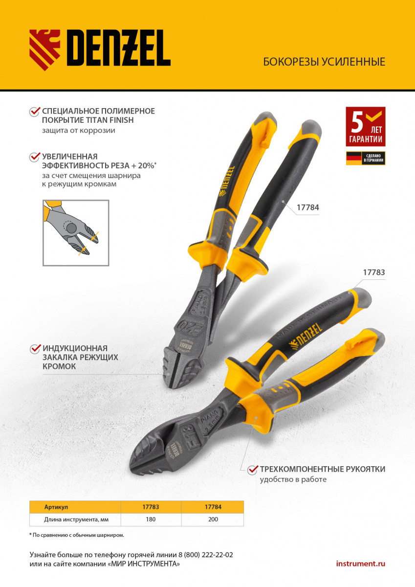 Усиленные бокорезы Denzel 17583 длиной 180 мм, с трехкомпонентными рукоятками, предназначены для разрезания кабелей, проводов, гвоздей и проволоки средней (750 Н/мм2) и высокой жесткости (1800 Н/мм2) диаметром 3,7 и 2,6 мм соответственно. Подходят для резки рояльных струн (предел прочности 2300 Н/мм2) диаметром до 2,2 мм. Успешно справляются не только с медными, алюминиевыми и пластмассовыми деталями, но и с более жесткими стальными элементами. Встроенный рычажный механизм и смещенный непосредственно к режущим кромкам шарнир увеличивают усилие реза на 20%.