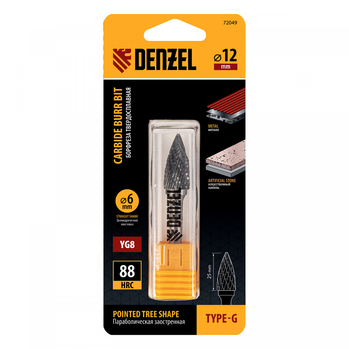Борфреза по металлу твердосплавная, параболическая заостренная, тип-G, 12 мм Denzel