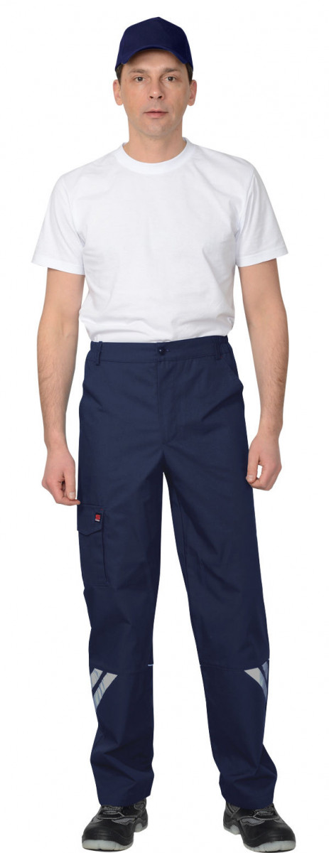 Брюки с притачным поясом, с застёжкой гульфика на молнию. В области боковых швов вставлена резинка для регулировки объёма. В области колена накладной карман. В костюме размещены СО полосы 50 мм и СВ кант для обеспечения безопасности работы в условиях пониженной видимости.
