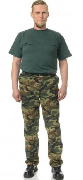 Брюки: прямого покроя, с двумя боковыми прорезными карманами и накладными карманами в районе колен.