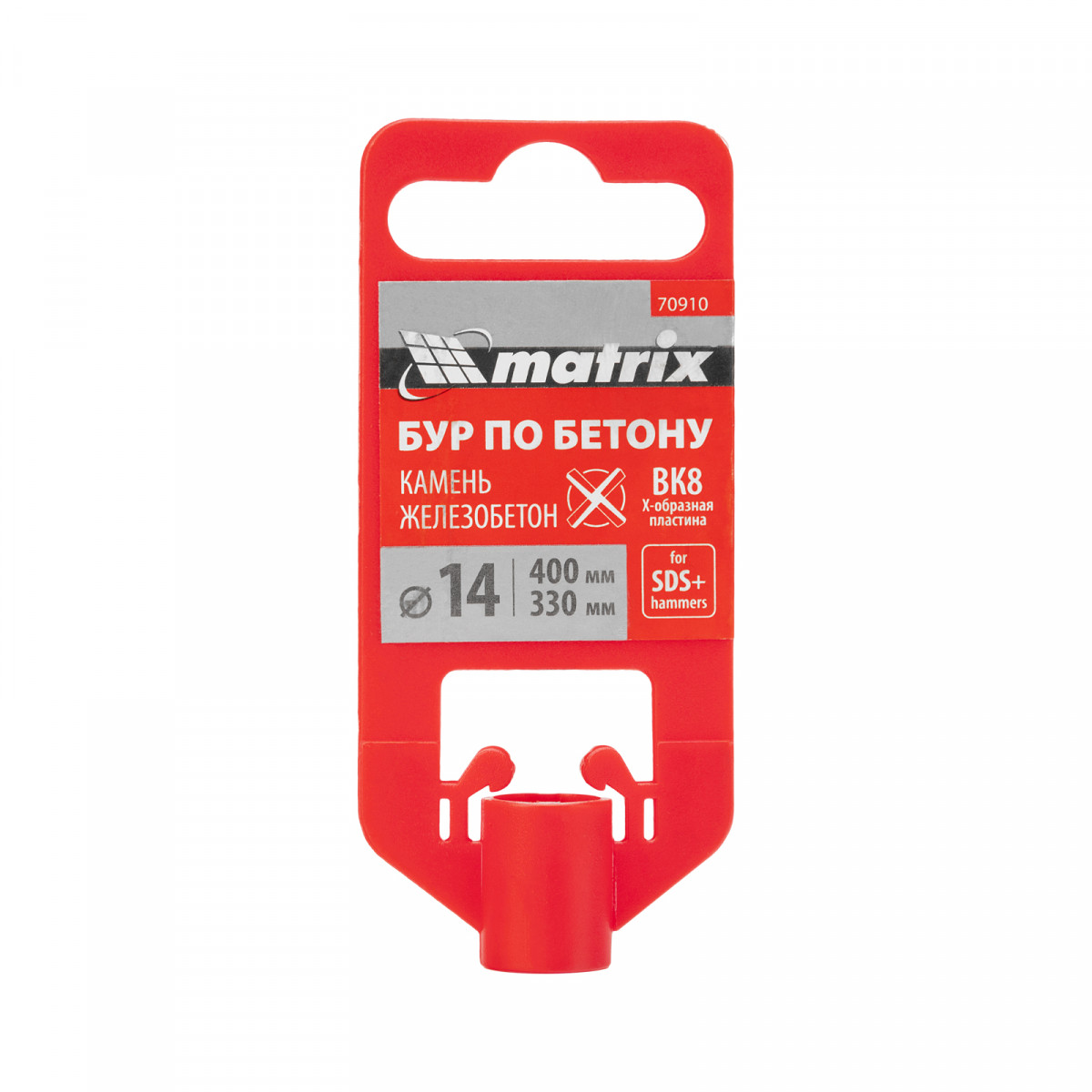 Бур по бетону Matrix 70910 длиной 400 мм, с хвостовиком SDS-plus и крестовой пластиной, предназначен для получения отверстий диаметром 14 мм в бетоне, камне и кирпиче. Крестовая пластина обеспечивает эффективную работу с твердыми материалами, в том числе армированным бетоном. Бур устанавливается в патрон перфоратора и используется во время проведения строительных работ.