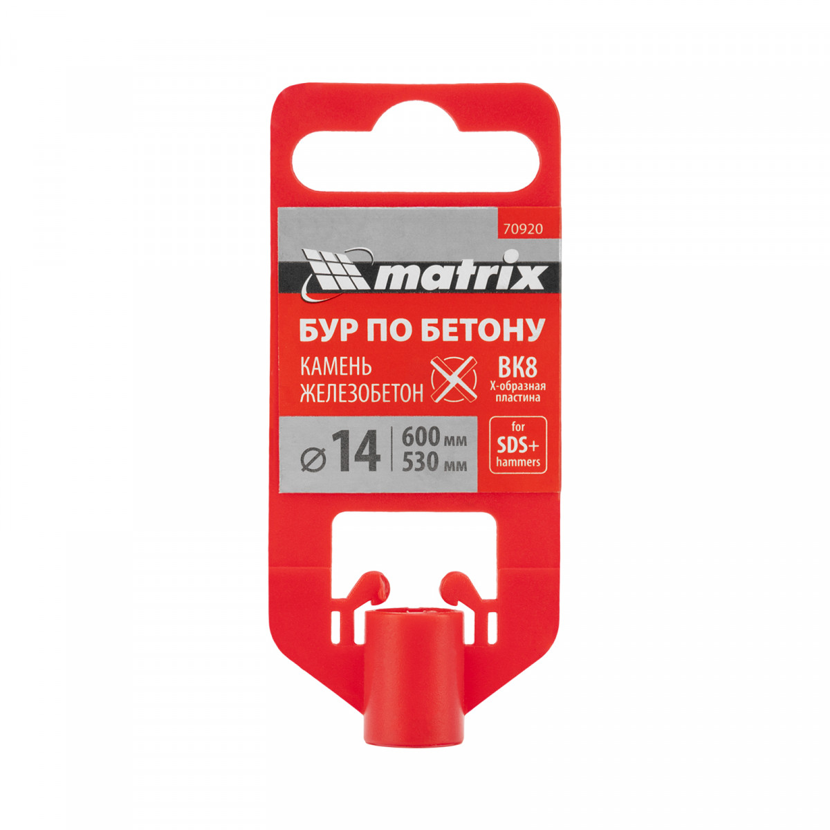 Бур по бетону Matrix 70920 длиной 600 мм, с хвостовиком SDS-plus и крестовой пластиной, предназначен для получения отверстий диаметром 14 мм в бетоне, камне и кирпиче. Крестовая пластина обеспечивает эффективную работу с твердыми материалами, в том числе армированным бетоном. Бур устанавливается в патрон перфоратора и используется во время проведения строительных работ.