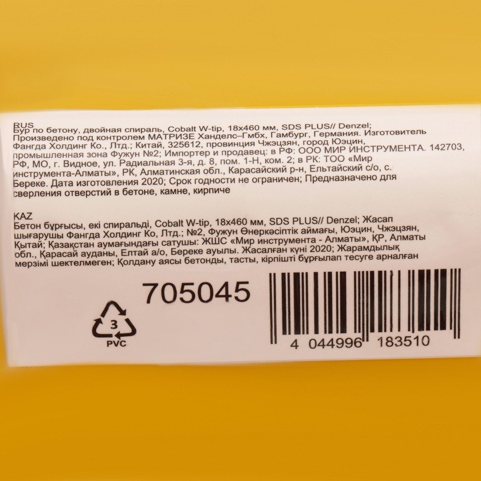 Бур по бетону, двойная спираль, три пылеотводящие кромки, 18 x 460 мм DENZEL