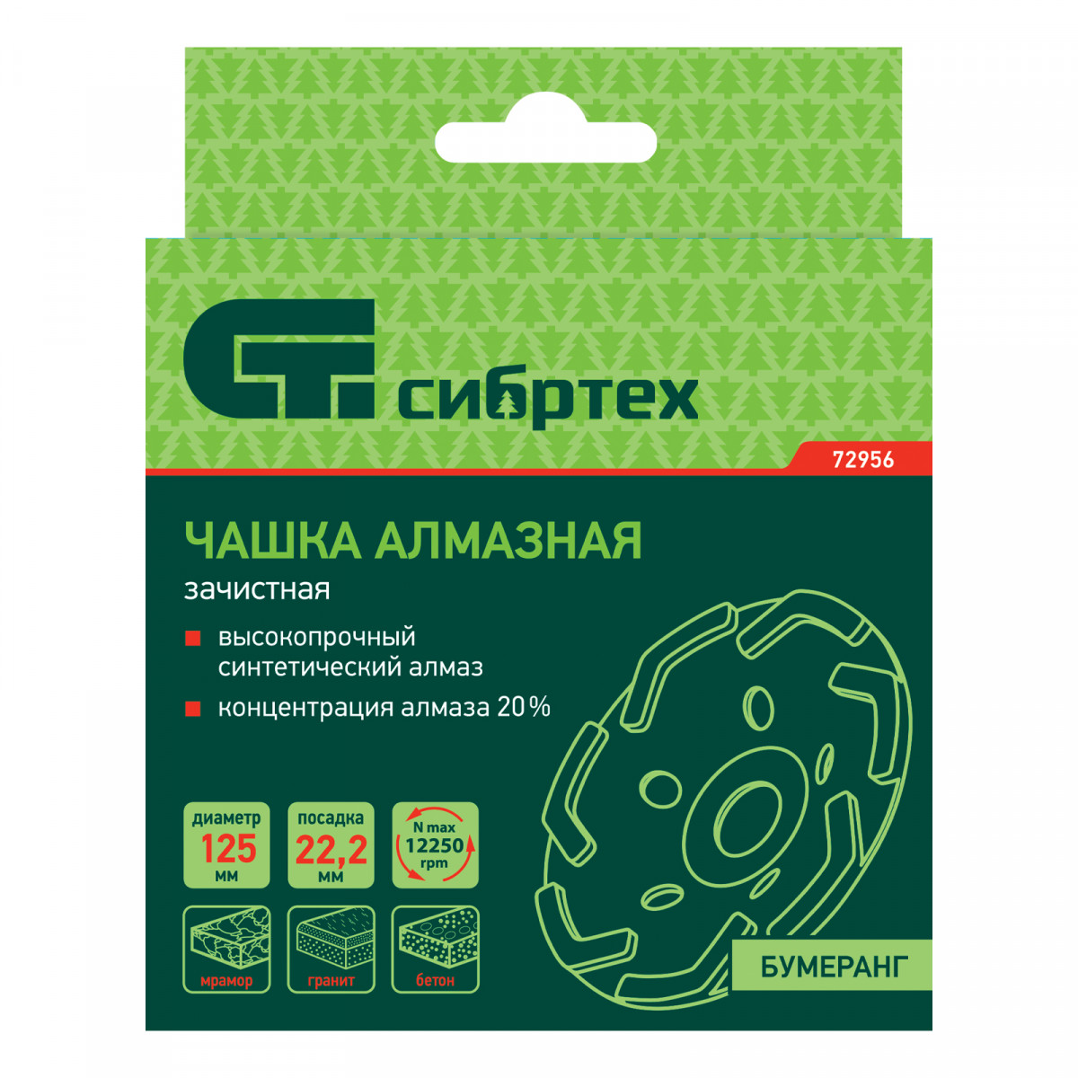 Зачистная алмазная чашка Сибртех «Бумеранг» 72956 диаметром 125 мм предназначена для обработки мраморных, гранитных, бетонных, кирпичных и каменных поверхностей. Универсальную чашку можно использовать для черновой обработки (снятия небольших неровностей) и для выравнивания, получения гладких поверхностей. Чашка используется в качестве оснастки для УШМ с посадочным диаметром 22,2 мм, рассчитана на бытовое применение.