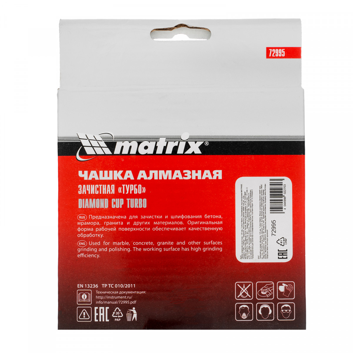 Алмазная зачистная чашка Matrix Turbo 72995 диаметром 125 мм устанавливается на вал углошлифовальной машины, для чего предусмотрено посадочное отверстие 22,2 мм. Используется для придания окончательной гладкости бетонным, каменным, мраморным, гранитным и кирпичным поверхностям, а также для снятия фаски на плитах из гранита или мрамора. Предназначена для профессионального применения.