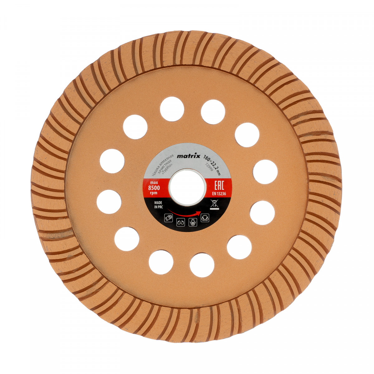 Алмазная зачистная чашка Matrix Turbo 72999 диаметром 180 мм устанавливается на вал углошлифовальной машины, для чего предусмотрено посадочное отверстие 22,2 мм. Используется для придания окончательной гладкости бетонным, каменным, мраморным, гранитным и кирпичным поверхностям, а также для снятия фаски на плитах из гранита или мрамора. Предназначена для профессионального применения.