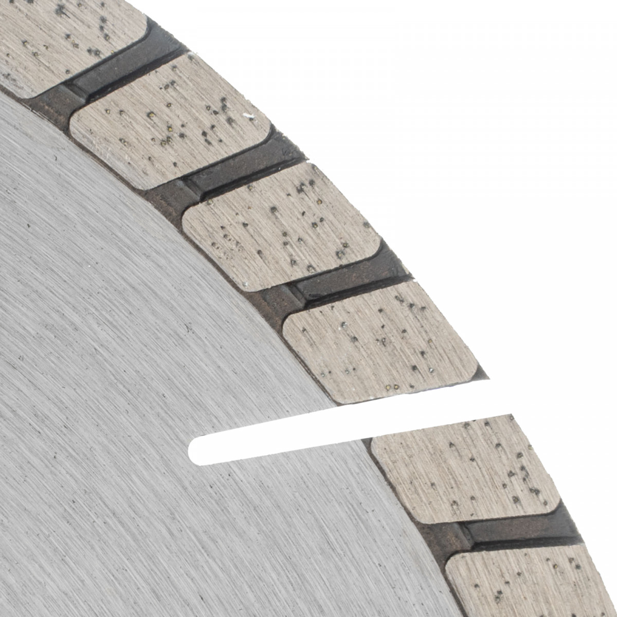 - Эффективная работа — благодаря турбо-сегментной форме диск быстро режет материалы, в т.ч. армированный бетон, водяное охлаждение не требуется.