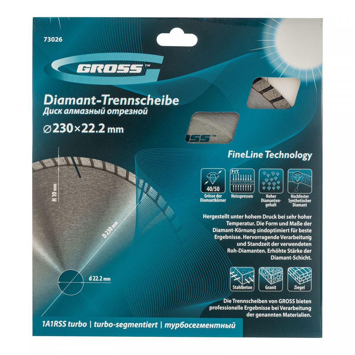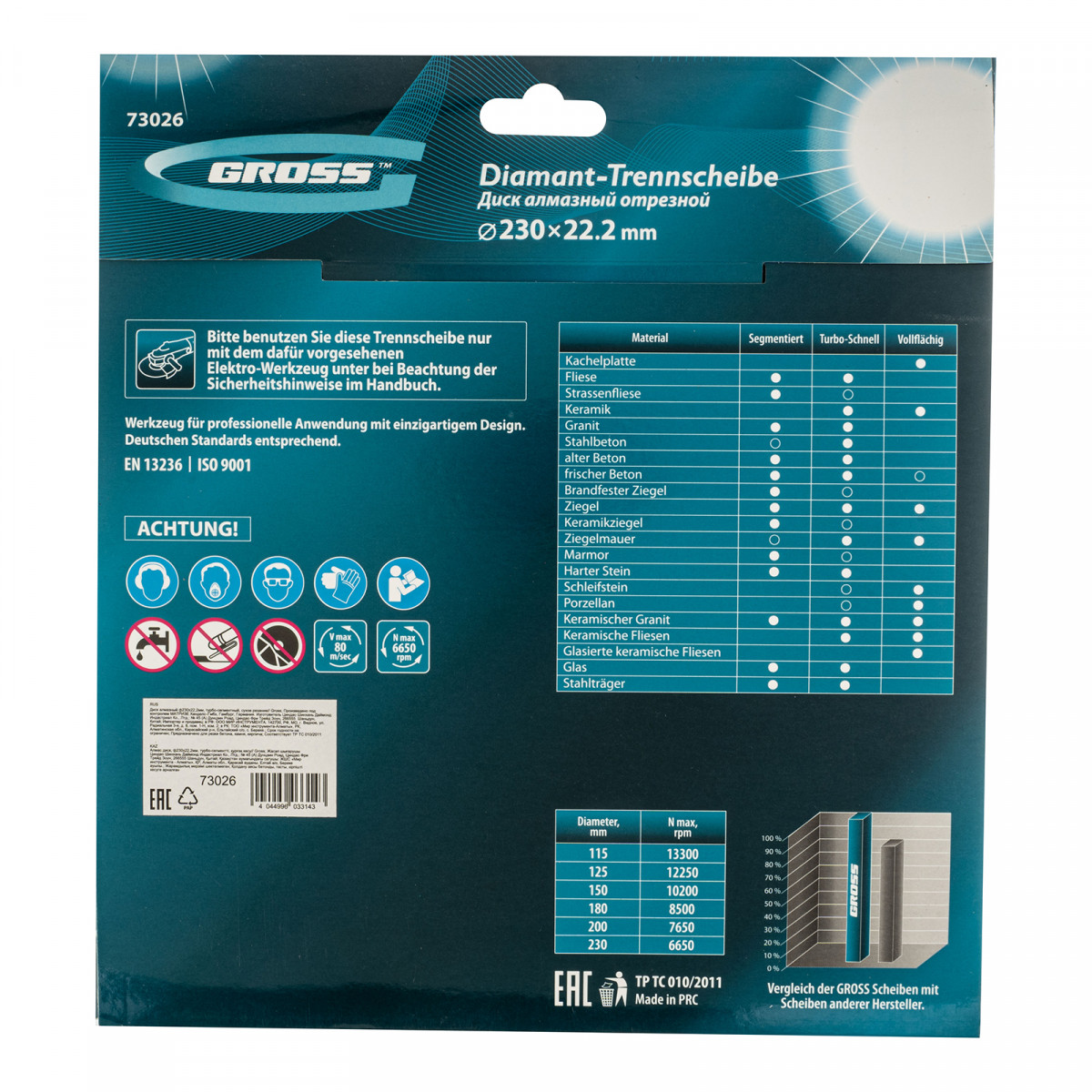 Алмазный турбо-сегментный диск Gross 73026 диаметром 230 х 22,2 мм, для сухой резки, — оснастка для УШМ со скоростью вращения до 6650 об/мин, предназначенная для отрезных работ. Универсальный диск с турбированной рабочей частью можно использовать для резки камня, гранита и кирпича, свежего бетона, а также слабоармированного железобетона. Он подходит для профессионального использования.