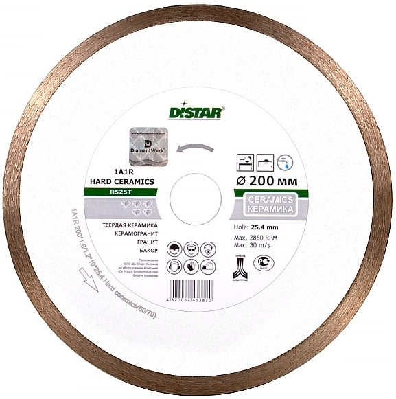 Диск отрезной алмазный диаметром 250 мм относится к серии 1A1R Hard ceramics и обладает самыми лучшими характеристиками. Он наилучшим образом подходит для резки твердой керамической плитки и керамогранита. Также он может использоваться для работы с твердым мрамором, травертином, известняком, доломитом. Отлично подходит для плиткорезов и используется для мокрой резки.