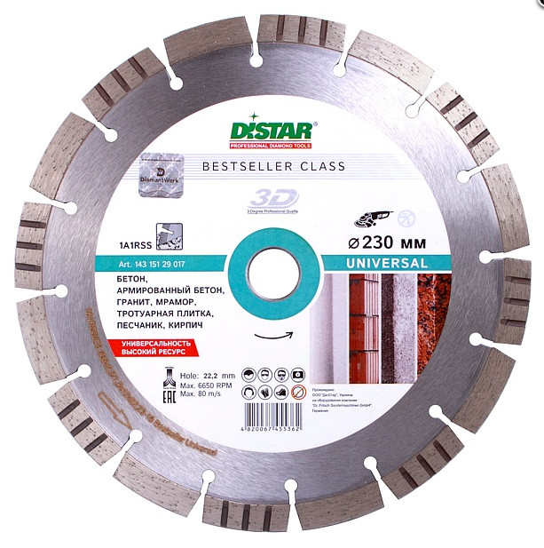 Класс диска Bestseller, его приобретают для бытовых работ, но и профессионалы часто используют такие алмазные диски в работе. Повышенные характеристики и уровень прохождения арматуры - плюсы модели.