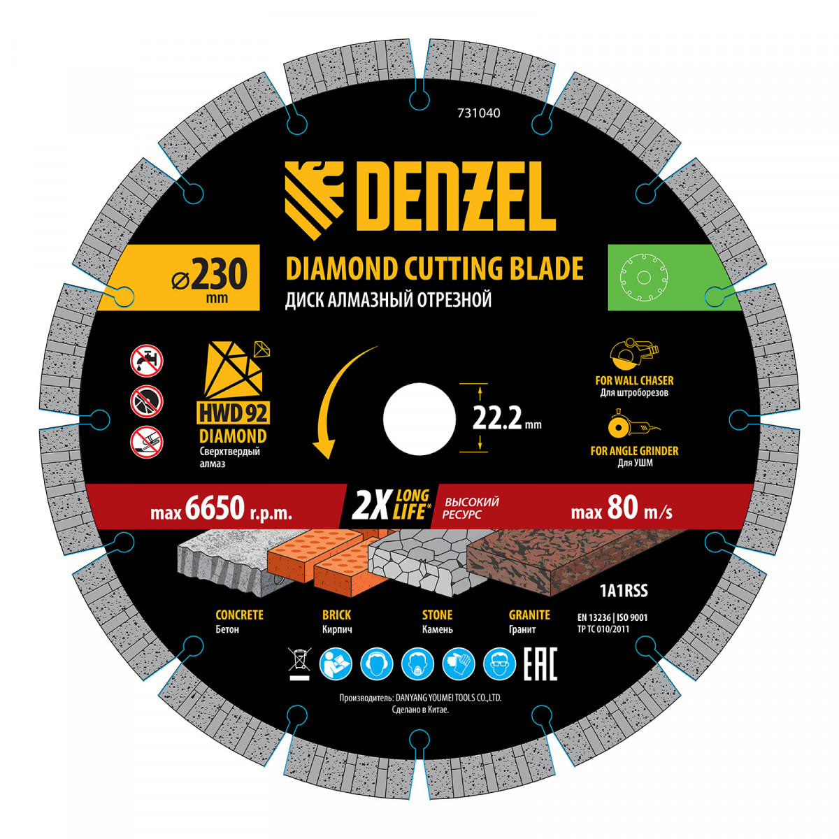 Алмазный отрезной диск Denzel 731040 диаметром 230 x 22,2 мм, с сегментной рабочей частью и слоем сверхтвердых алмазов HWD92, предназначен для сухого резания бетона, камня, кирпича, гранита. Используется с углошлифовальной машиной (УШМ) или штроборезом, поддерживающими частоту вращения 6650 об/мин.