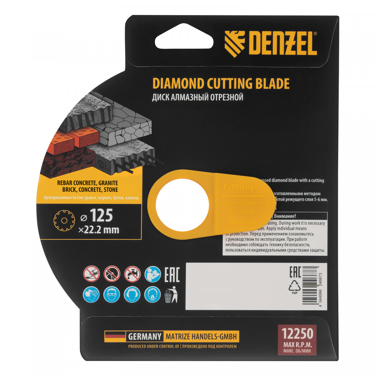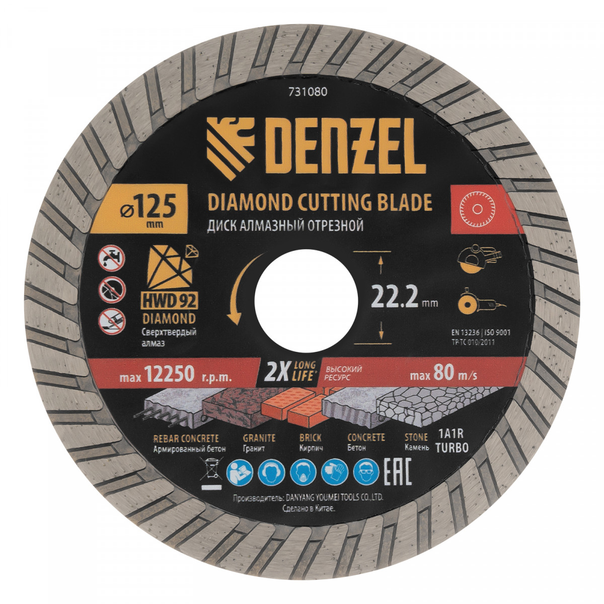 Алмазный отрезной диск Турбо Denzel 731080 диаметром 125 мм, с посадочным размером 22,2 мм и слоем сверхтвердых алмазов HWD92, устанавливается на углошлифовальную машину (УШМ) или штроборез. Используется для сухого резания камня, бетона (в том числе армированного), гранита, кирпича. Рекомендуемая частота вращения — 12250 об/мин.
