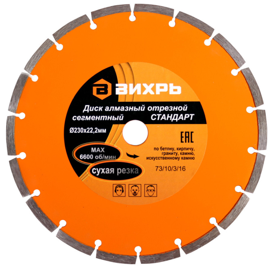 Диск алмазный отрезной сегментный СТАНДАРТ, 230 х 22,2 мм, сухая резка Вихрь - это алмазный отрезной диск, который используется совместно с угловыми шлифмашинами (болгарками) для сухой резки гранитных, бетонных, кирпичных и каменных изделий.