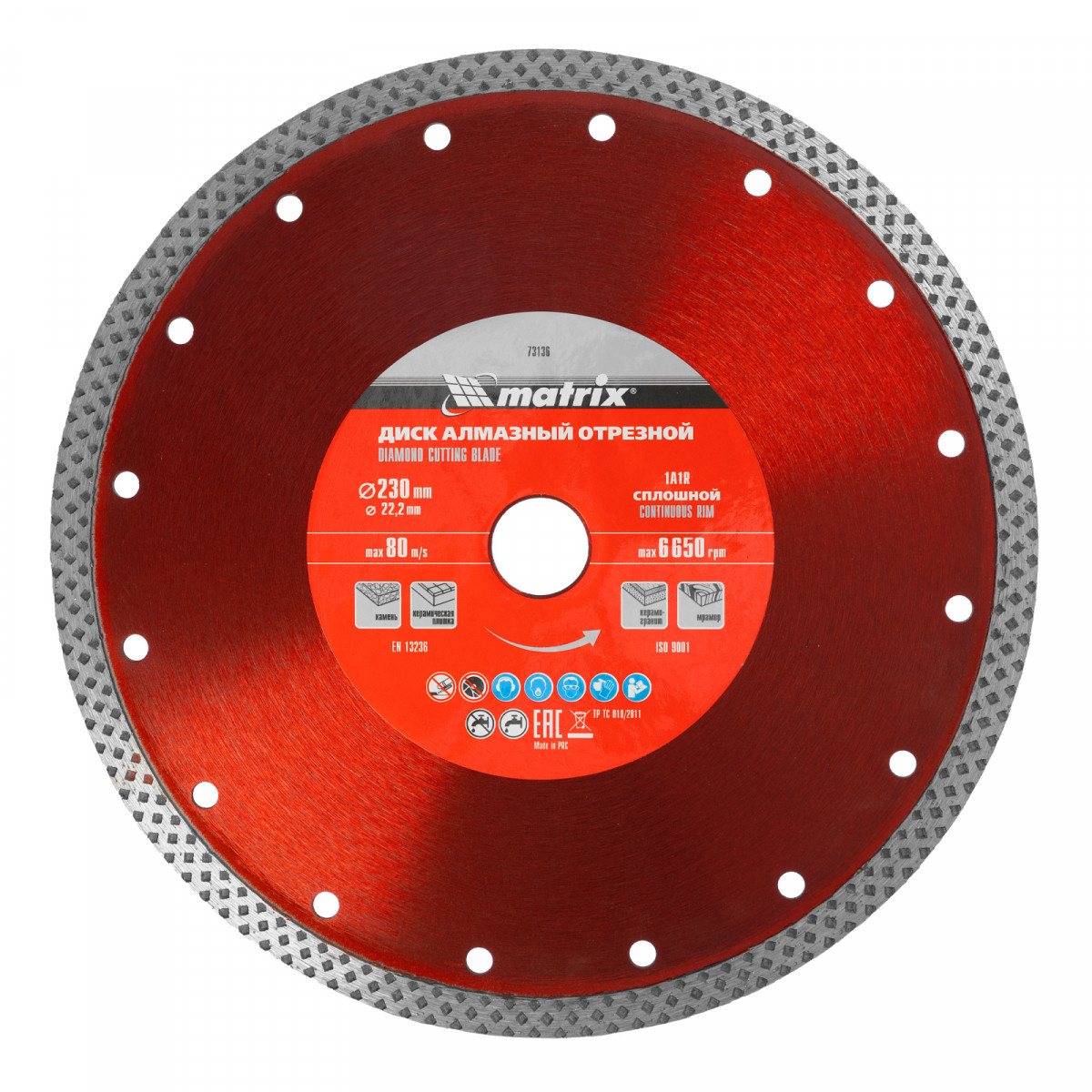 Сплошной отрезной алмазный диск Matrix 73136 диаметром 230 мм — оснастка для болгарок и плиткорезов с диаметром вала 22,2 мм. Применяется для сухого и мокрого резания мрамора, искусственного и натурального камня, керамогранитной и керамической плитки. Использование без подачи воды расширяет возможности инструмента, но для увеличения ресурса диска рекомендуется применять водяное охлаждение. Оснастка предназначена для решения бытовых задач.