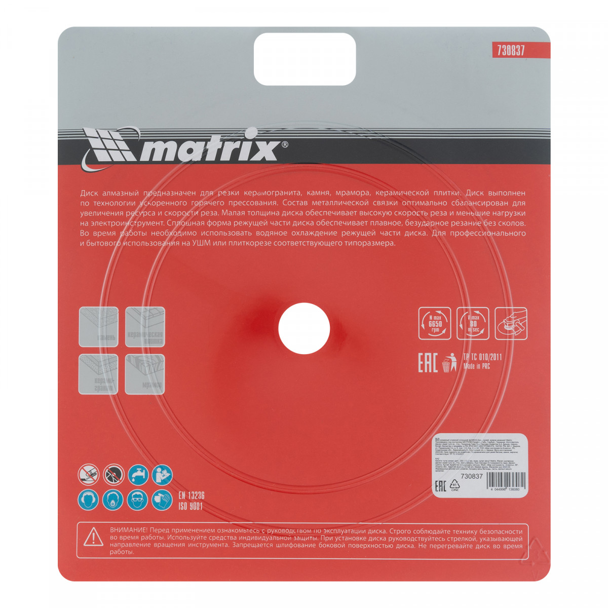 Отрезной сплошной алмазный диск Matrix ф230х22,2 мм 730837, тонкий, обеспечивает мокрое резание плотных материалов: керамогранита, керамической и кафельной плитки, мрамора, натурального и искусственного камня. Он устанавливается на УШМ или плиткорезы и используется с применением водяного охлаждения. Диск увеличивает производительность на 20% благодаря небольшой толщине 2,1 мм и снижению нагрузки на инструмент.