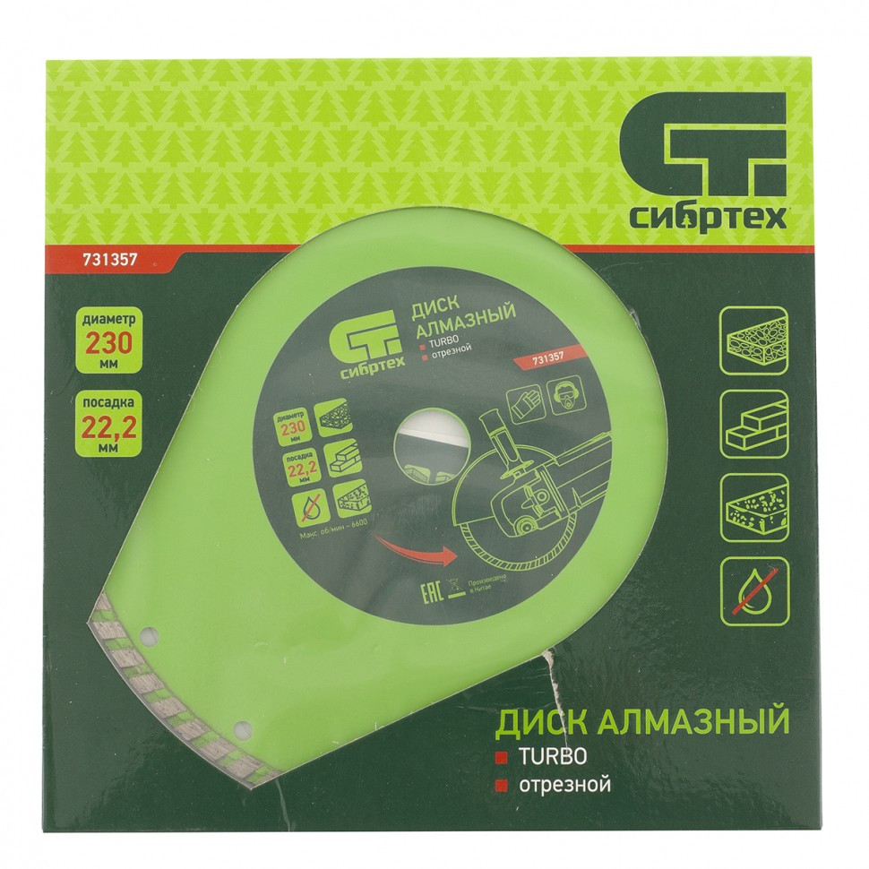 Алмазный отрезной диск Сибртех Turbo 731357 для сухой резки, диаметром 230 х 22,2 мм, устанавливается на углошлифовальную машину. Позволяет резать твердые материалы: бетон, железобетон, камень, песчаник. Диск предназначен для бытового использования.