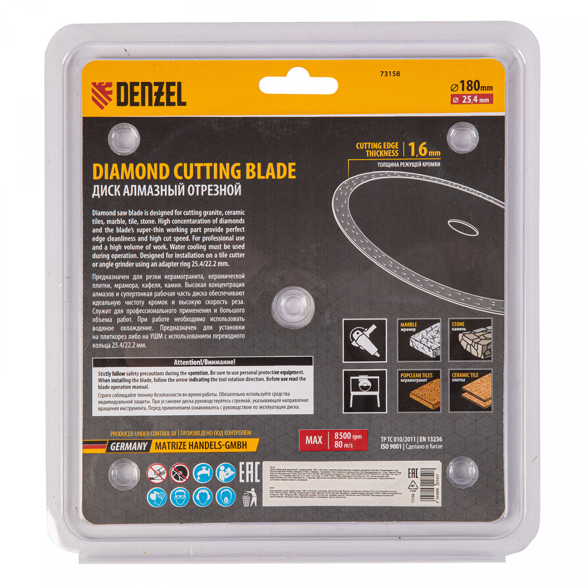 Диск алмазный сплошной, супертонкий, 180 х 25,4 мм, горячее прессование, мокрое резание Denzel