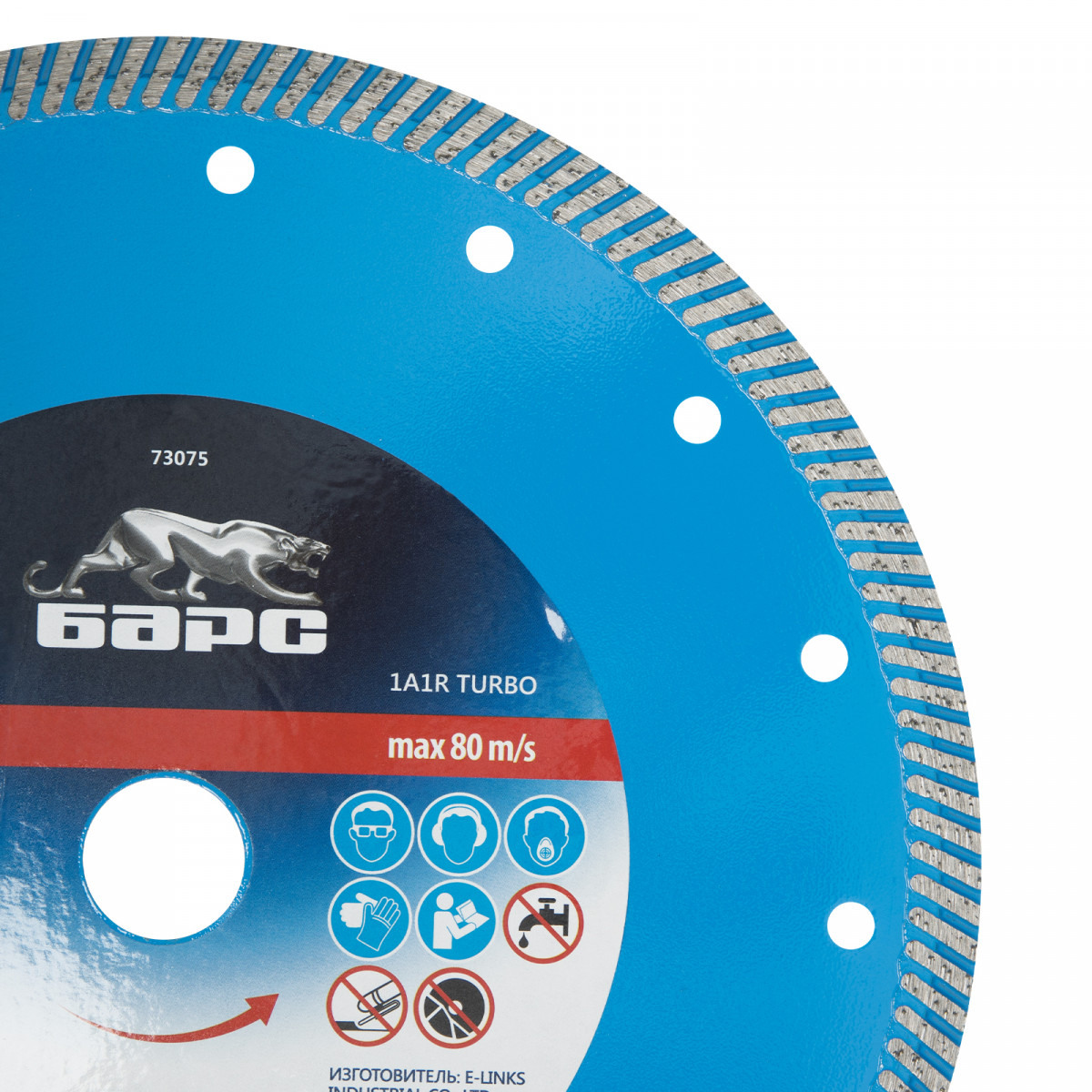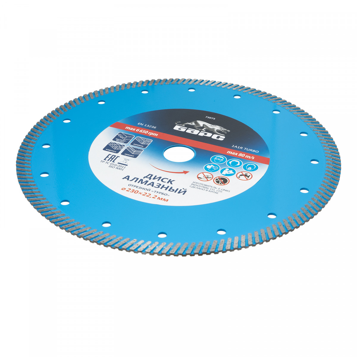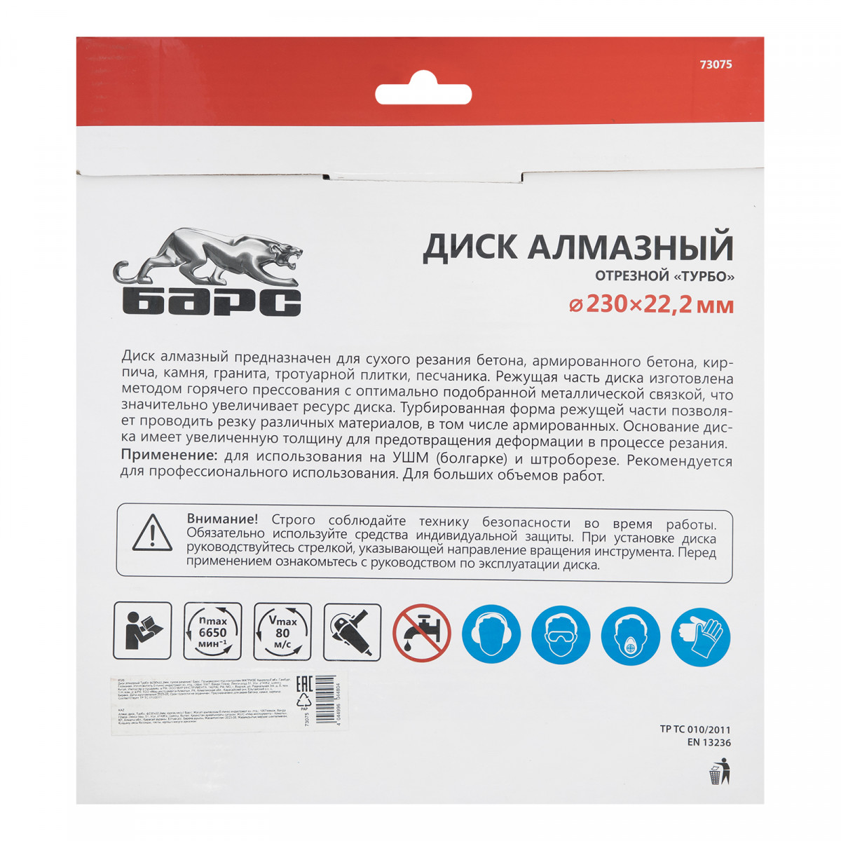 Алмазный диск Барс Турбо 73075 диаметром 230 х 22,2 мм предназначен для сухого резания бетона, в т.ч. свежего, среднеармированного железобетона, камня, кирпича, гранита и песчаника. Совместим с УШМ с посадочным диаметром 22,2 мм, используется для проведения строительных и ремонтных работ.