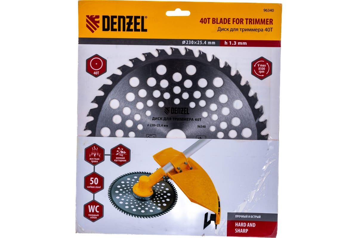 Диск для триммера Denzel 96340 внешним диаметром 230 мм и внутренним — 25,4 мм, толщиной 1,3 мм, с 40 зубьями, совместим со всеми бензотриммерами Denzel и Сибртех, а также электротриммерами Denzel 96611 и 96612. Он используется для скашивания травы, подпиливания веток кустарника и молодых деревьев.Преимущества