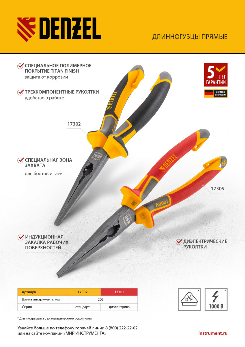 Прямые длинногубцы Denzel 17302 длиной 205 мм, с трехкомпонентными рукоятками, используются для работы с мелкими деталями и крепежом. Позволяют удерживать, сгибать и перекусывать провода или проволоку. Максимальный диаметр перерезаемой мягкой проволоки (алюминиевой, медной, с пределом прочности 220 Н/мм2) составляет 3,9 мм, проволоки средней жесткости и гвоздей (750 Н/мм2) — 3,2 мм, жесткой (1800 Н/мм2) — 2,2 мм. Инструмент оптимален для манипуляций в ограниченном пространстве. Ровные насечки на зажимных частях обеспечивают надежный захват и удержание деталей. Длинногубцы будут полезны во время проведения электромонтажных работ, ремонта оргтехники, техобслуживания автомобиля, пригодятся также в быту.