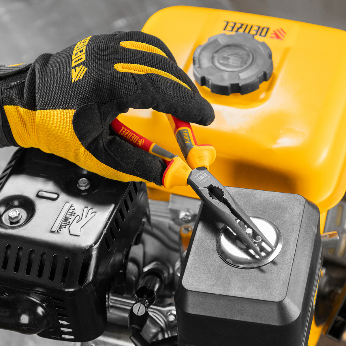 Прямые длинногубцы Denzel 17305 длиной 205 мм, с диэлектрическими трехкомпонентными рукоятками, рассчитанными на напряжение до 1000 В, используются для работы с мелкими деталями и крепежом. Позволяют удерживать, сгибать и перекусывать провода или проволоку. Максимальный диаметр перерезаемой мягкой проволоки (алюминиевой, медной, с пределом прочности 220 Н/мм2) составляет 3,9 мм, проволоки средней жесткости и гвоздей (750 Н/мм2) — 3,2 мм, жесткой (1800 Н/мм2) — 2,2 мм. Инструмент оптимален для манипуляций в ограниченном пространстве. Ровные насечки на зажимных частях обеспечивают надежный захват и удержание деталей. Длинногубцы будут полезны во время проведения электромонтажных работ, ремонта оргтехники, обслуживания автомобиля, пригодятся также в быту.