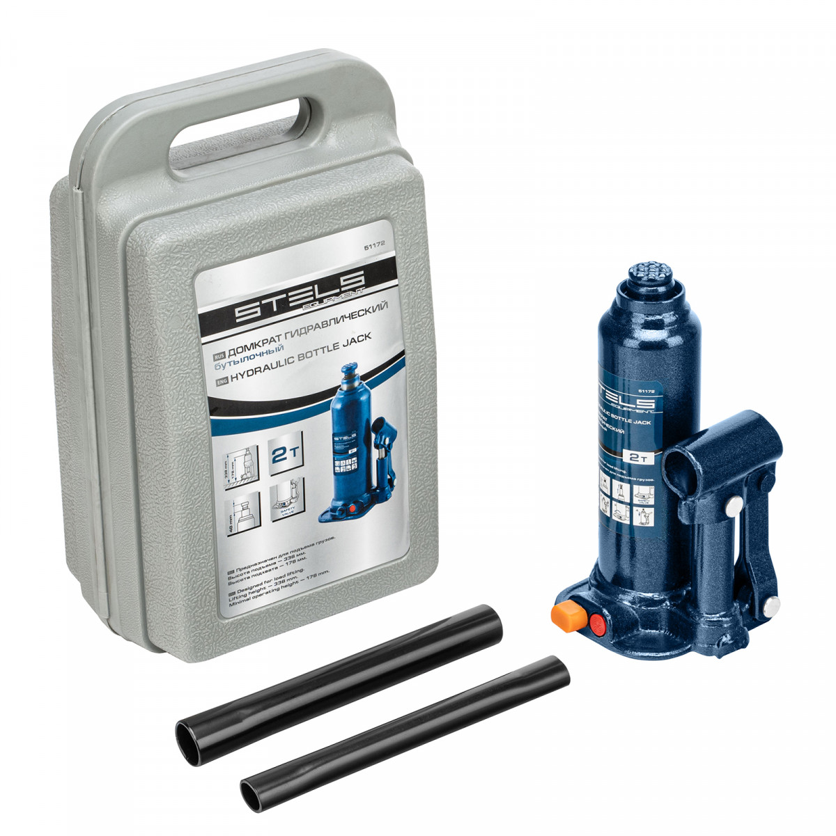 Гидравлический бутылочный домкрат Stels 51172 в пластиковом кейсе предназначен для поднятия грузов весом до 2 т на высоту 178-338 мм. Он не занимает много места и легко помещается в багажник, поэтому его можно брать с собой в дорогу или хранить в гараже. Используется для самостоятельного ремонта авто, также подходит для профессионального применения на станциях технического обслуживания.