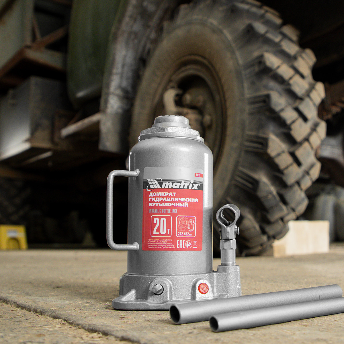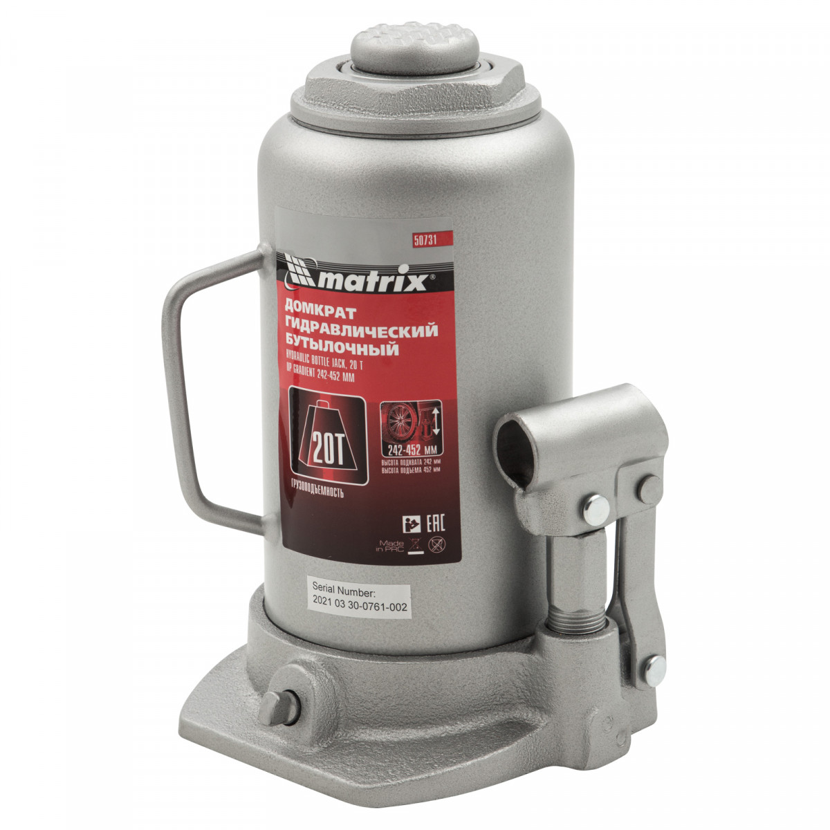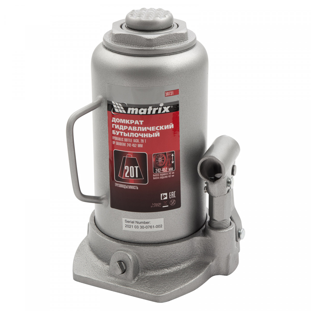 Домкрат гидравлический бутылочный, 20 т, высота подъема 242-452 мм Matrix