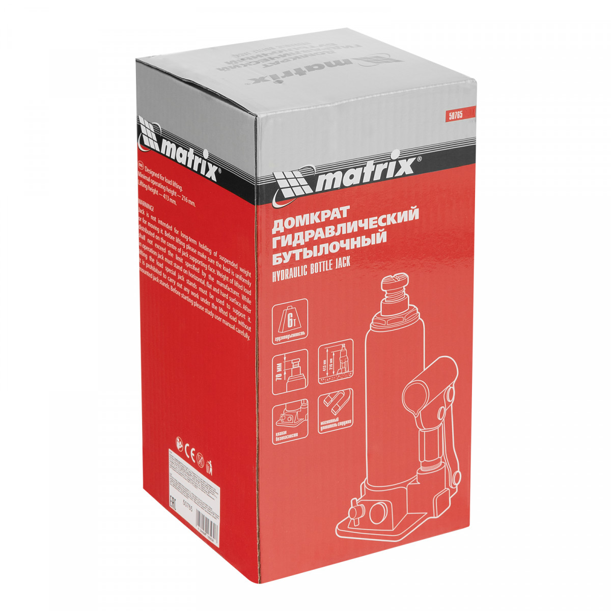 Домкрат гидравлический бутылочный, 6 т, h подъема 216-413 мм Matrix