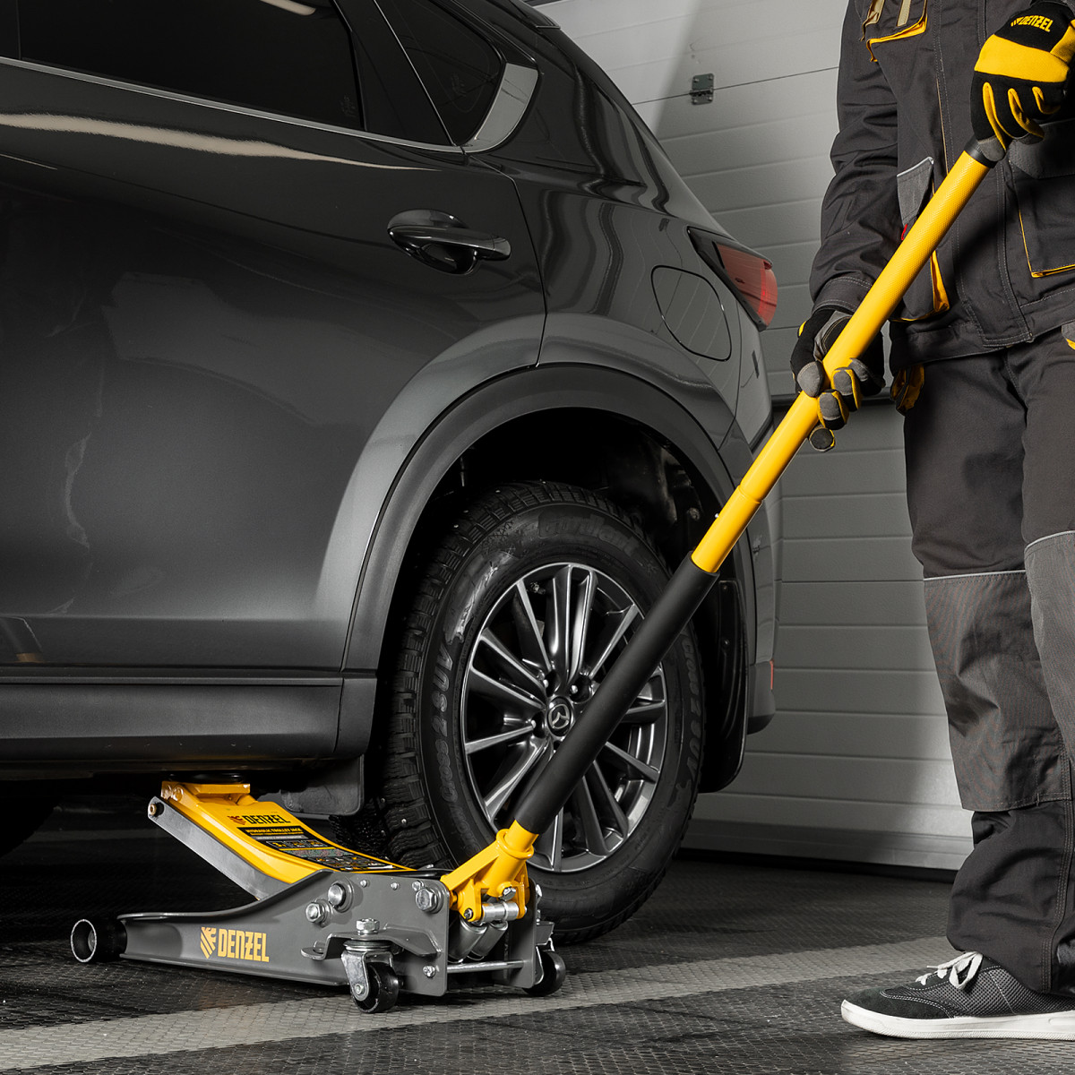 Профессиональный подкатной гидравлический домкрат Denzel 51250 с низким подхватом используется для быстрого подъема на высоту 75-500 мм всех типов автомобилей массой до 3 т и с любым клиренсом, в том числе сверхнизким. В гидравлическом блоке предусмотрено 2 насоса (система быстрого подъема QUICK LIFT), благодаря чему для достижения предельной высоты достаточно 6 качков рукоятки. Домкрат подходит для использования на станциях профессионального техобслуживания и шиномонтажа, а также для личного использования.