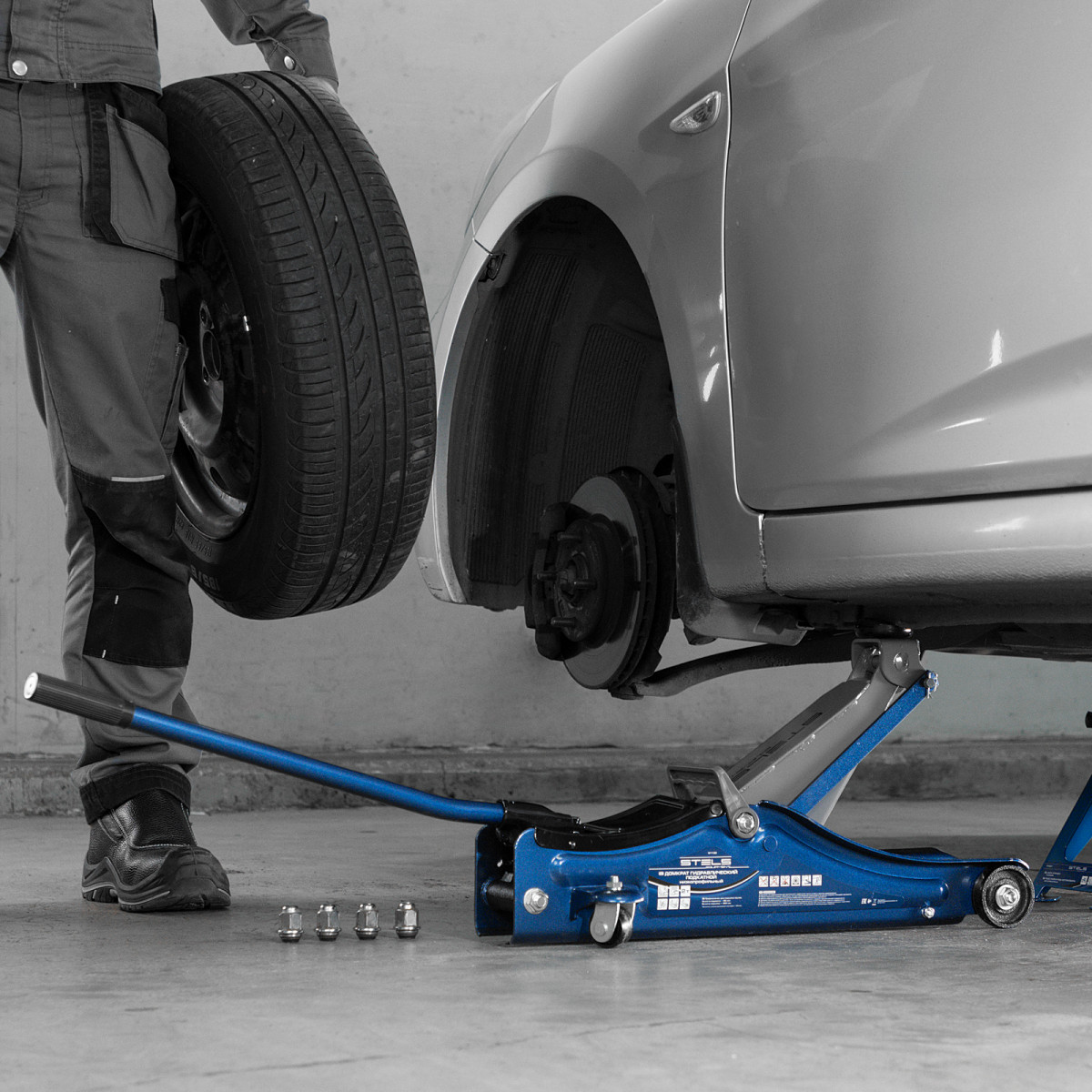 - Маневренность — благодаря поворотным колесам домкрат можно быстро подвести под груз.