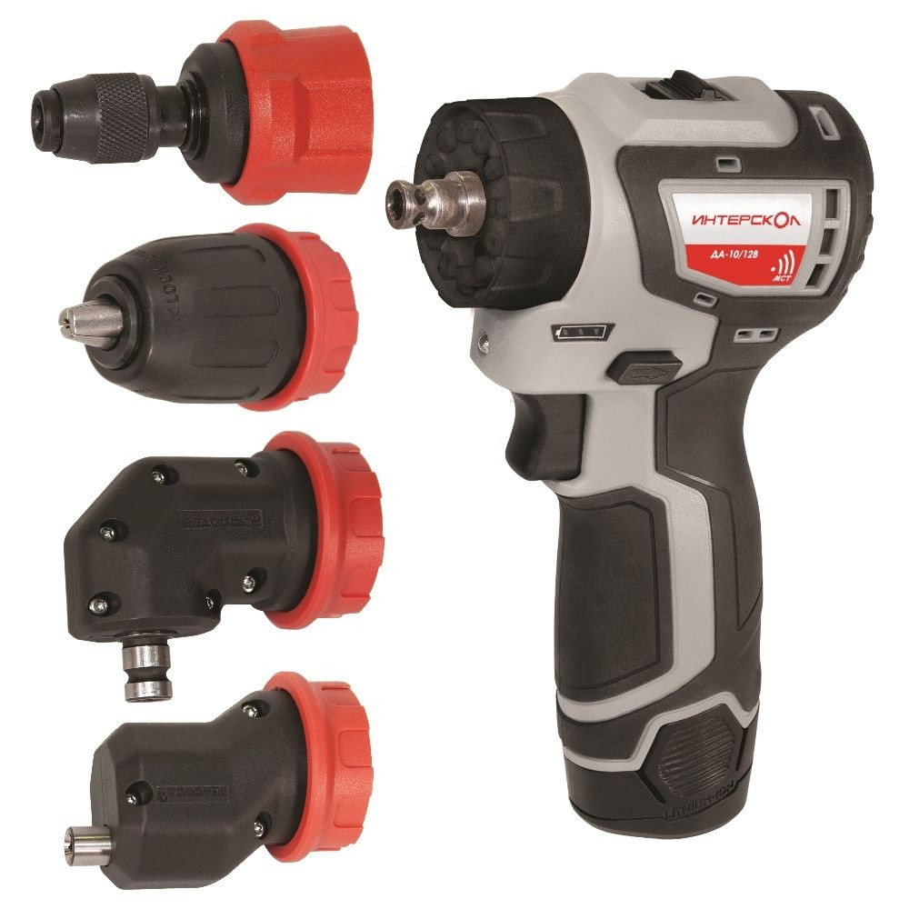 комплектуется насадками для закручивания вплотную к углу, углового закручивания/ сверления, а так же насадкой с механическим зажимом для хвостовиков HEX 1/4”;