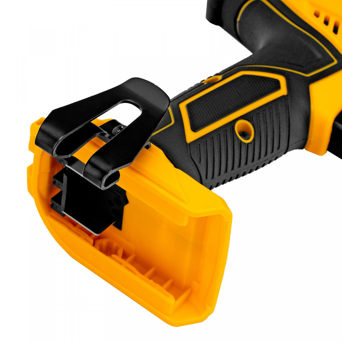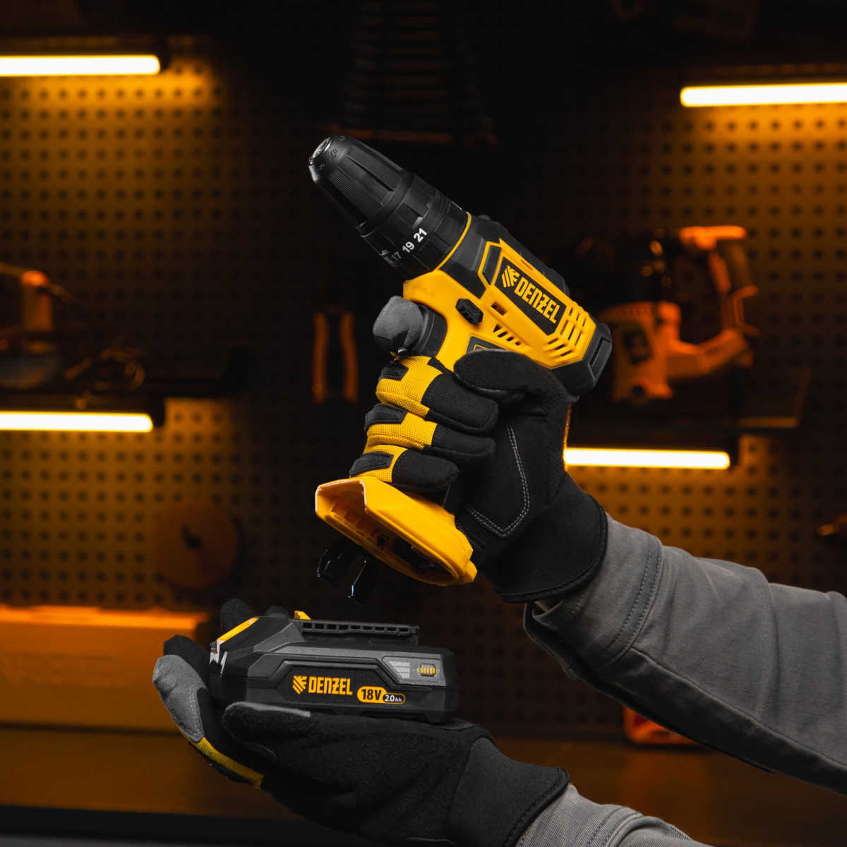 - Универсальность — дрель-шуруповерт совместима с любым Li-Ion аккумулятором и зарядным устройством единой платформы Denzel Battery System 18V.