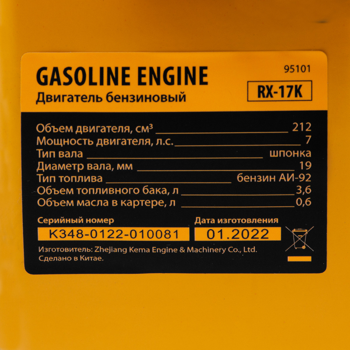Четырехтактный бензиновый двигатель Denzel RX-17K 95101 мощностью 7 л. с. и объемом 212 см3, с типом горизонтального вала шпонка 19 мм, имеет ручной старт и воздушное охлаждение. Предназначен для использования в качестве привода садово-парковой и строительной техники (садовых измельчителей, мотопомп, бензиновых моек высокого давления и др.). Обеспечивает бесперебойное функционирование оборудования и эффективное выполнение сельскохозяйственных, строительных работ, а также решение прочих задач на загородном участке.