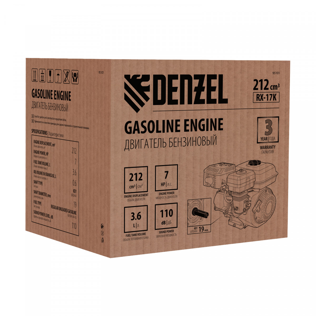 Двигатель бензиновый RX-17K, 7 л.с., 212 см3, горизонтальный вал шпонка 19 мм Denzel