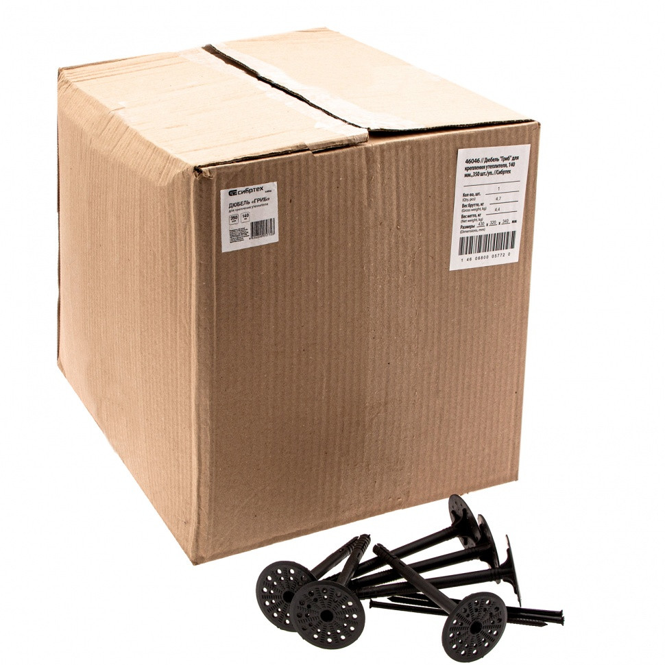 Дюбель Сибртех «Гриб» 46046 длиной 140 мм, 350 шт. в упаковке, предназначен для крепления утеплителя на бетонных и каменных стенах. За счет малого веса он не создает нагрузки на основание. Дюбель используется в строительстве при проведении работ по утеплению стен и фасадов.