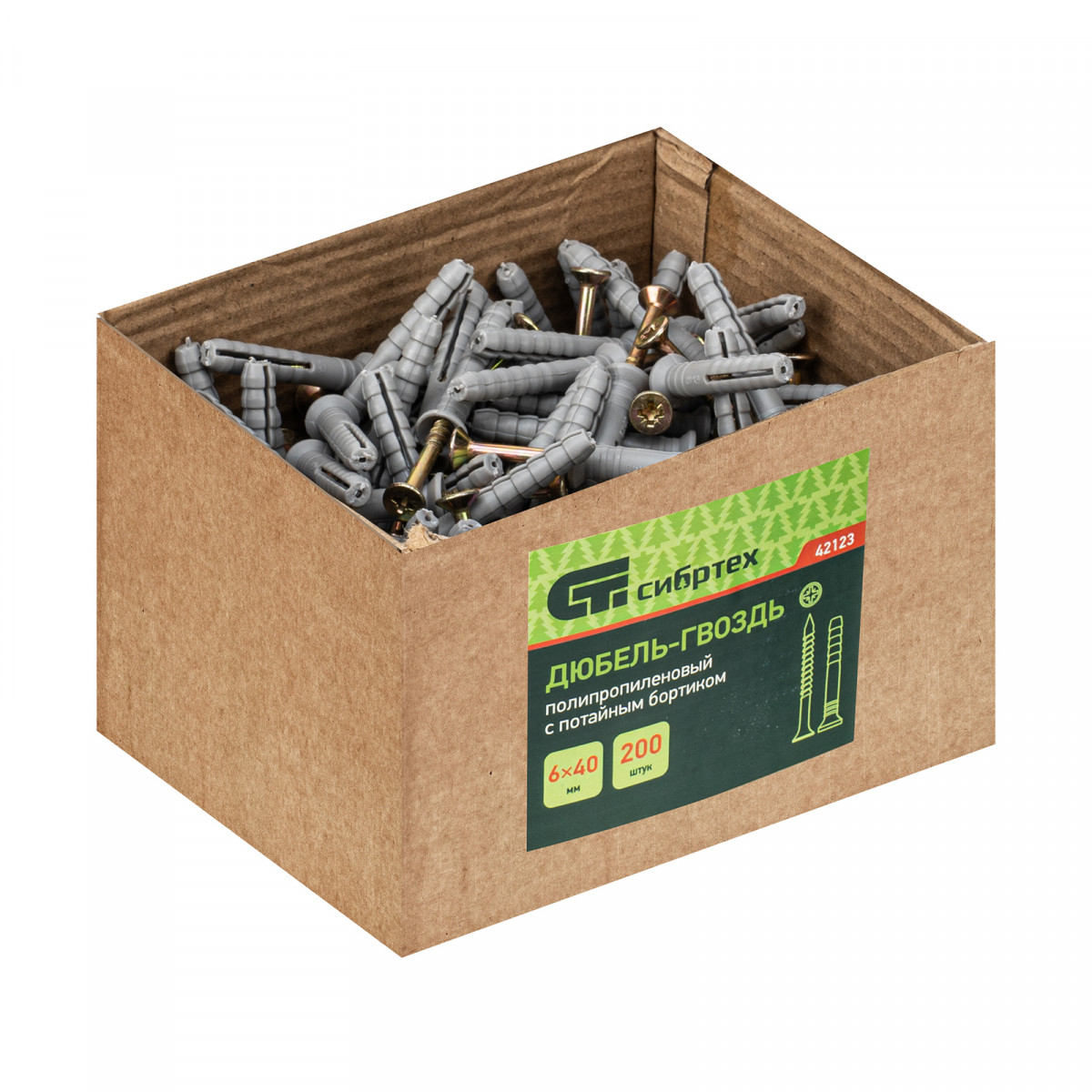 Дюбель-гвоздь полипропиленовый с потайным бортиком 6 х 40 мм, 200 шт Сибртех