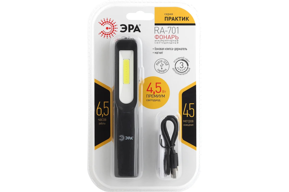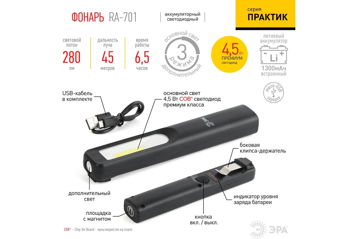 Фонарь ЭРА RA701 Практик ЗВт COB, 3Вт LED, магнит, клипса держатель Б0039623 - компактный аккумуляторный фонарь специальной серии ЭРА Практик, которая отличается сверхъяркой технологией "мультикристалл на плате" и набором удобных креплений.