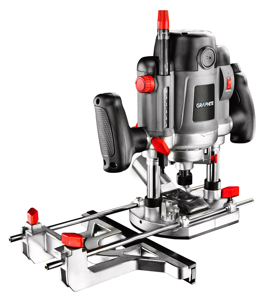 "Вертикальный фрезер GRAPHITE с производительным двигателем с мощностью 1300 ВТ, предназначен для фрезерования отверстий, пазов, кромок и профилей на всех видах материалах, деревянных и древесных плит, а также пластика и алюминия. Устройство имеет функцию плавной регулировки оборотов и глубины фрезерования. Диапазон частоты вращения на холостом ходу составляет от 11000 до 28000 мин-1. Фрезерный станок имеет блокировку шпинделя и блокировкой глубины фрезерования. Глубина фрезерования может регулироваться с помощью трех приборов: 8-ступенчатого odbojnika ограничителя глубины, ограничитель глубины с плавной настройкой (диапазон 0-55 мм) ручки для точной регулировки глубины (точность 0,1 мм). Устройство имеет прочную алюминиевую ногу с накладкой из пластмассы, обеспечивающей великолепную управляемость аппарата после разного рода поверхностях. Направляющие двигателя, фрезерные станки, встроенные в алюминиевом корпусе, с гнездами, помещенными в специализированной обработке поверхности, благодаря чему у