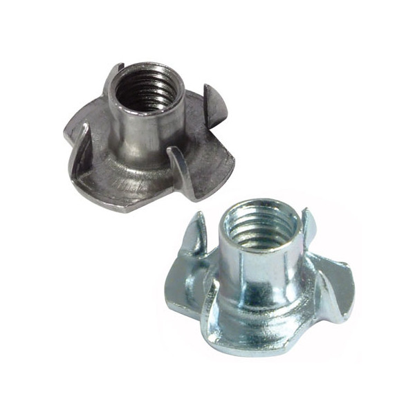 Стальная оцинкованная гайка крыльчатая врезная (забивная) DIN 1624 имеет специальные зубья, предотвращающие проворачивание гайки, что позволяет производить монтаж с одной стороны. Применяется при производстве мебели.