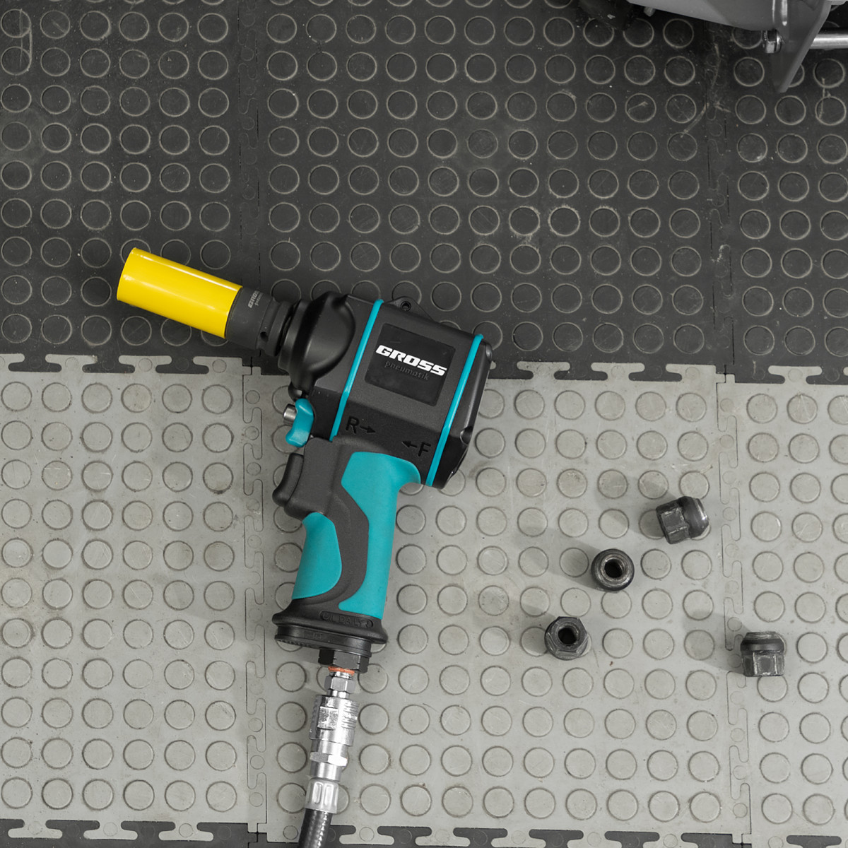 Пневматический ударный гайковерт Gross G985K2 57445 с максимальным крутящим моментом 610 Нм и присоединительным квадратом 1/2″, с частотой вращения шпинделя 9000 об/мин, входит в набор из 17 предметов и упрощает закручивание/раскручивание резьбовых высоконагруженных соединений на винтах, болтах и гайках. Для него подойдет маломощный компрессор, т.к. инструмент расходует небольшое количество воздуха от 120 л/мин. Гайковерт применяется как в быту, так и в профессиональной сфере — в гараже, сборочном цехе, автосервисе, на строительной площадке.