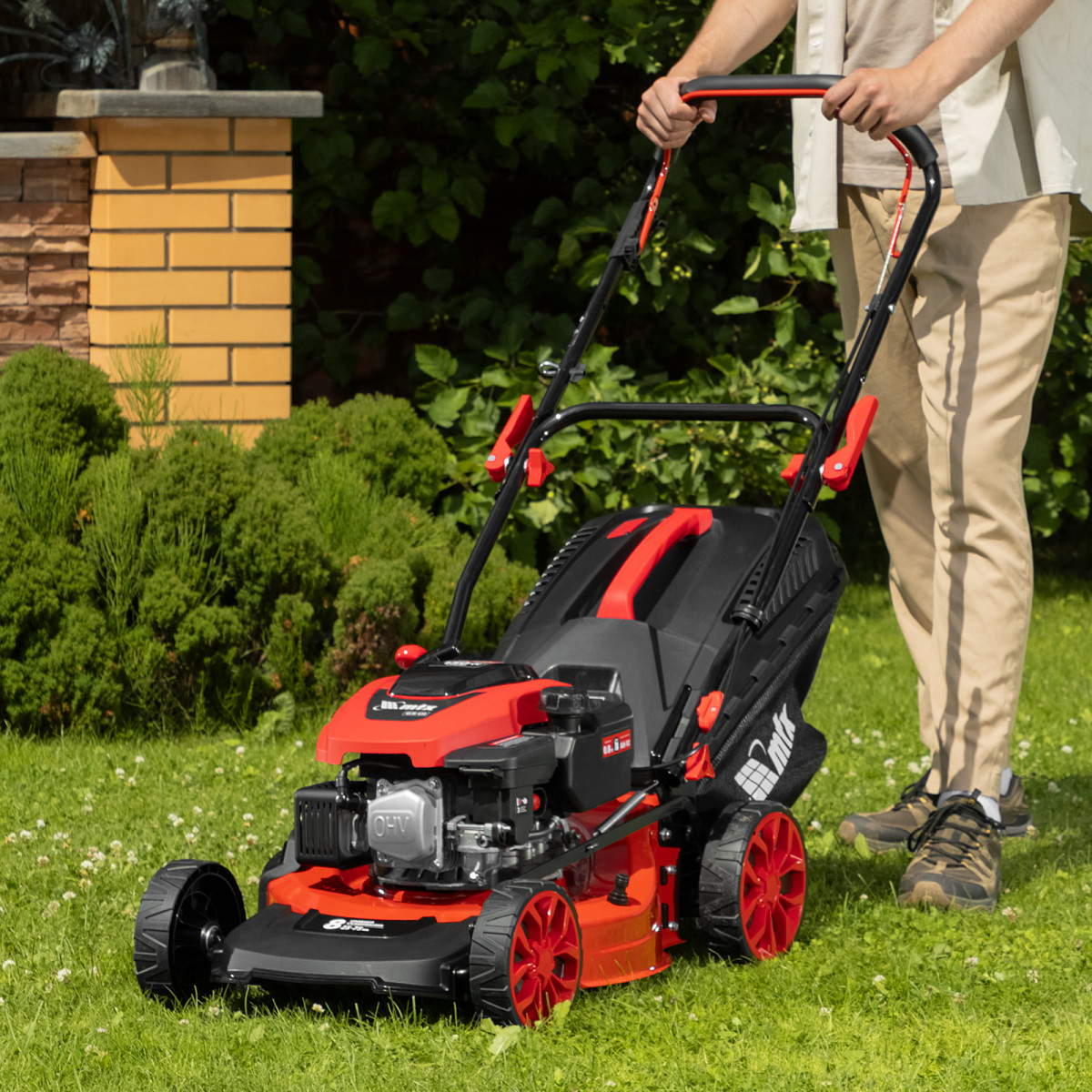• Компактность — благодаря складной рукоятке и комбинированному травосборнику газонокосилка не занимает много места в зоне хранения.