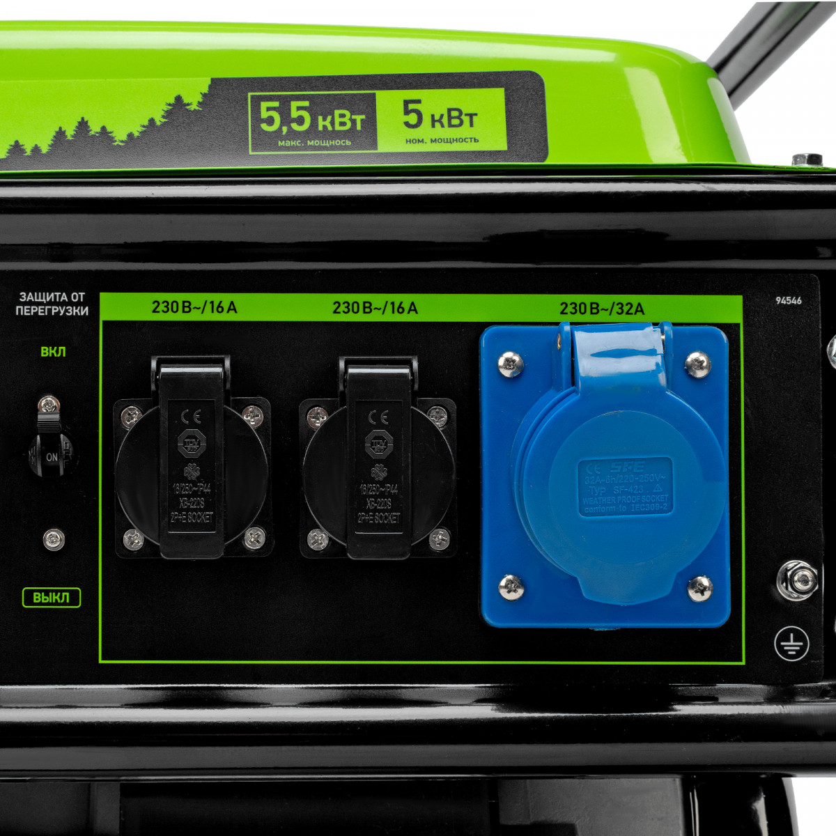 Бензиновый генератор Сибртех БС-6500 94546 на 230 В, с 4-тактным двигателем, баком на 25 л и ручным стартером, выдает 5,5 кВт и подходит для создания целой электросети в загородном доме, магазине, мастерской или на строительной площадке. К нему можно одновременно подключить 5 ламп накаливания, холодильник, телевизор. Для подключения приборов предусмотрено 3 розетки. Одна из них силовая на 32А, что позволяет запитать мощное оборудование, например, электрическую плиту.