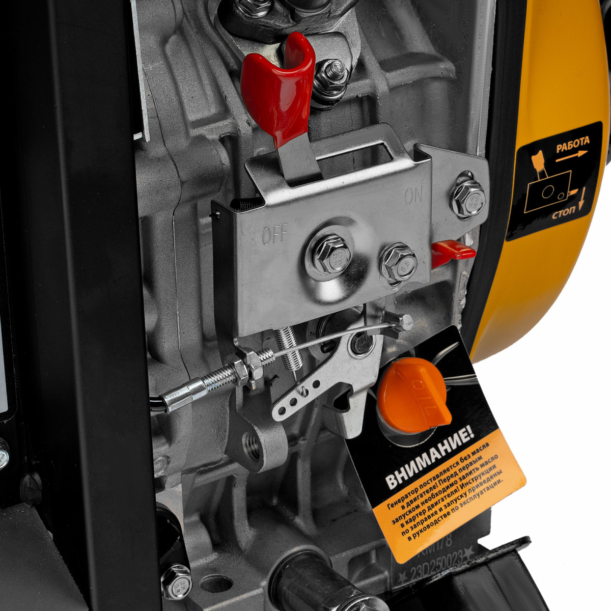 • Защита двигателя — генератор не запустится при недостаточном уровне масла в картере, фильтры препятствуют попаданию твердых частиц в цилиндры и посторонних примесей в топливо.