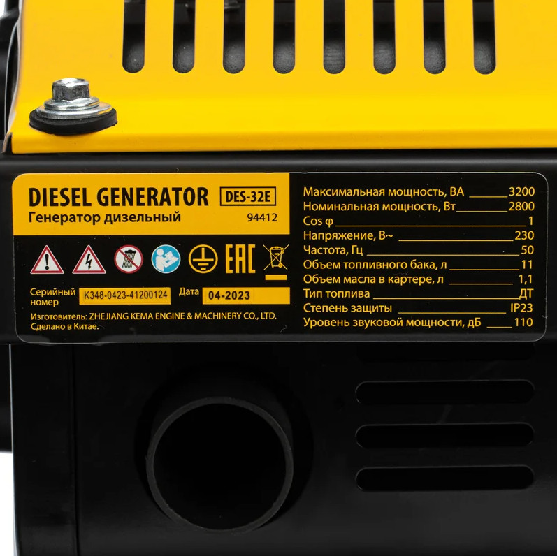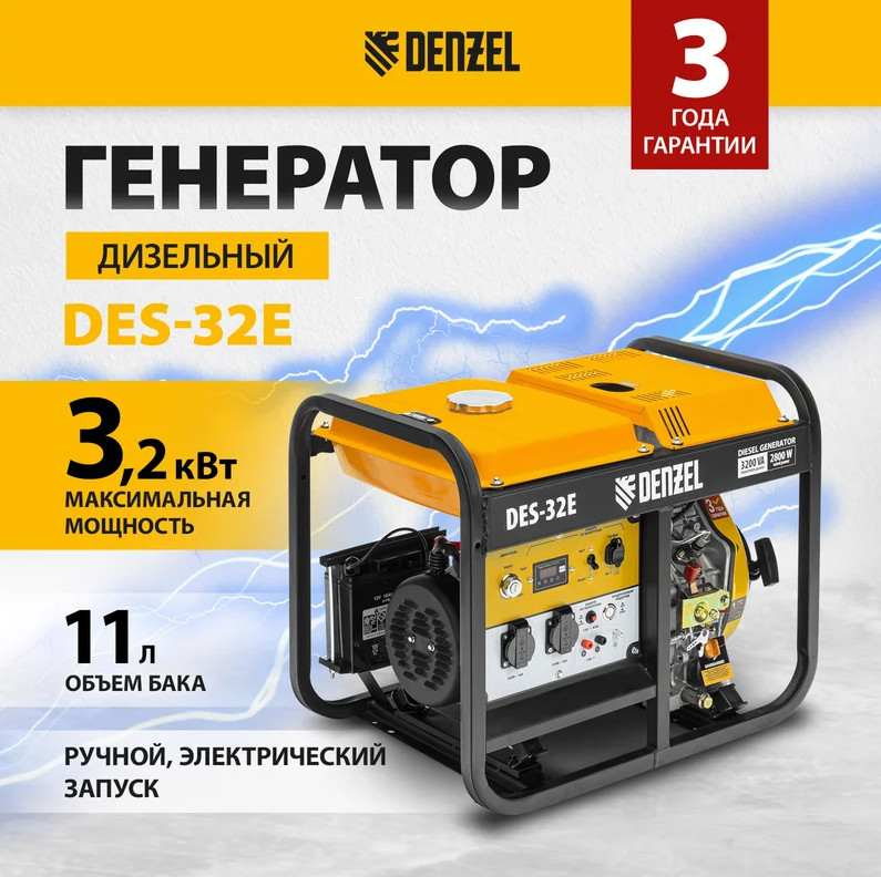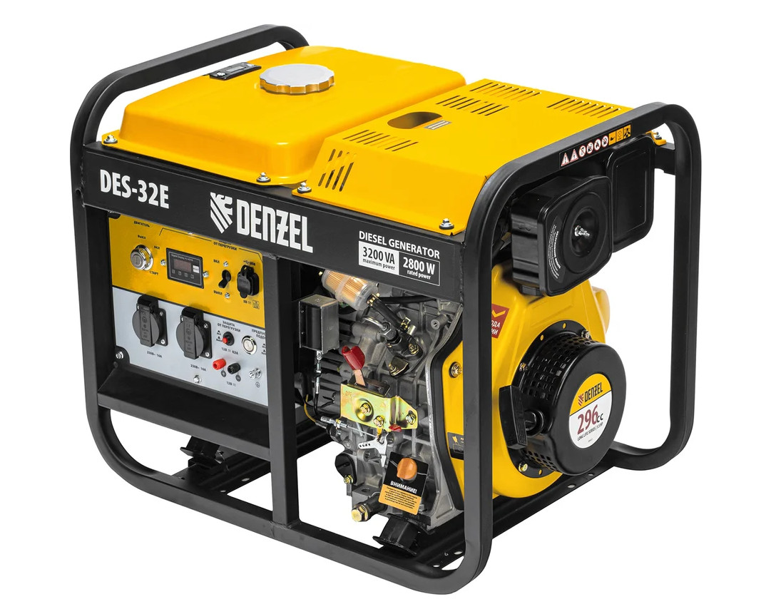 Дизельный генератор имеет максимальную выходную мощность 3,2 кВт и поддерживает напряжение в сети 230 В. Используется для снабжения энергией потребителей однофазного тока (осветительных приборов, бытовой техники, электроинструмента) при отсутствии доступа к стационарному источнику питания. Для подключения электроприборов служат 2 розетки 230 В/16 А. Клеммы постоянного тока 12 В позволяют заряжать автомобильные аккумуляторы, а двойной выход USB 5 В предназначен для подключения мобильных устройств (планшетов, смартфонов и т. д.). Генератор пригодится в загородном доме. Особенности - Функция предпускового подогрева